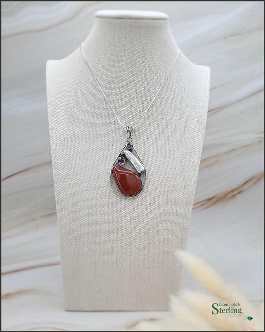Carnelian, Mother of Pearl, Amethyst and Sterling Silver Pendant