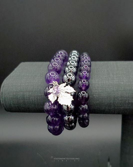 Amethyst, Hemetite and Sterling Silver Beaded Leaf Bracelet Set
