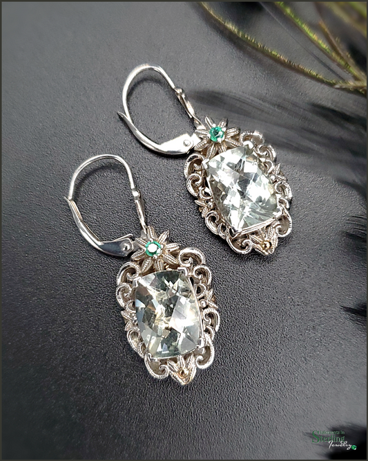 Vintage Prasiolite, Zambian Emerald and Sterling Silver Victorian Earrings