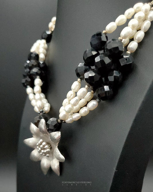 Black Onyx and Freshwater Pearl Sterling Silver Flower Necklace