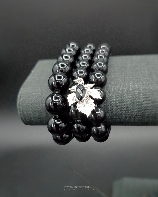 Black Obsidian and Sterling Silver Beaded Leaf Bracelet Set