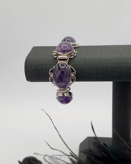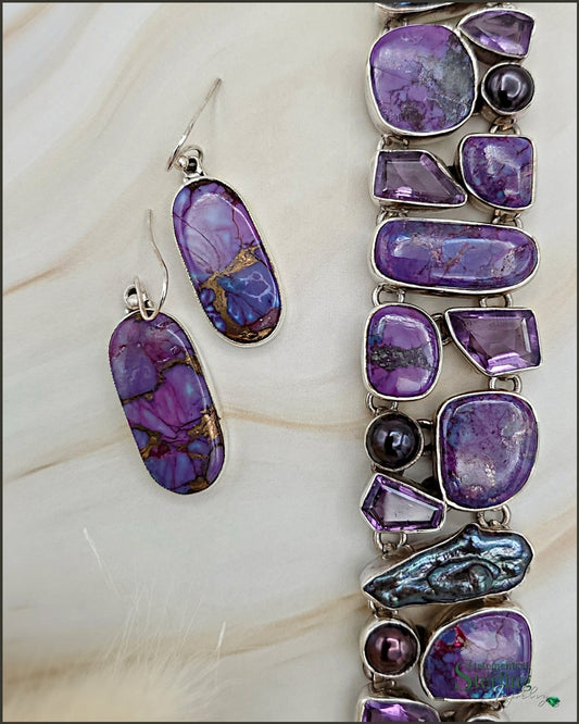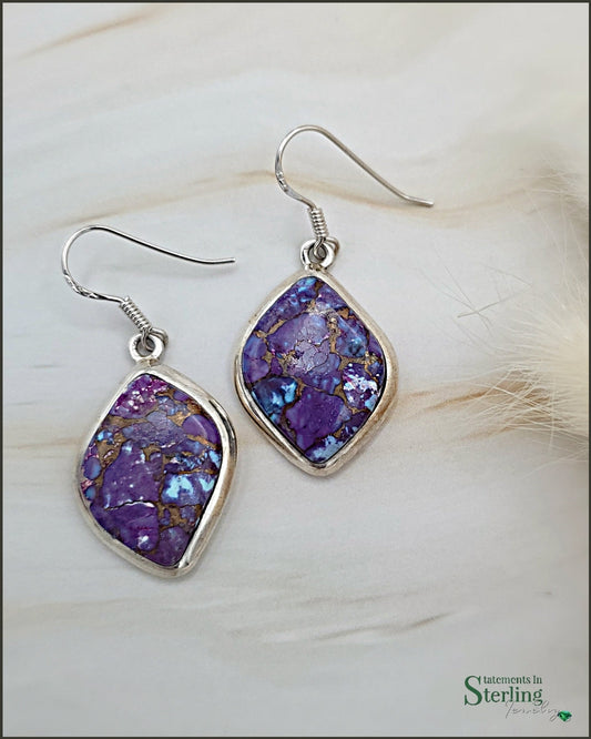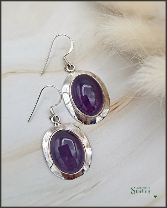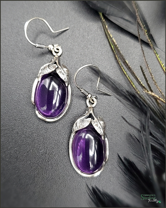 Purple African Amethyst Cabochon and Sterling Silver Leaves Earrings