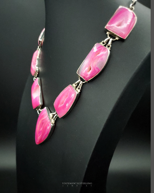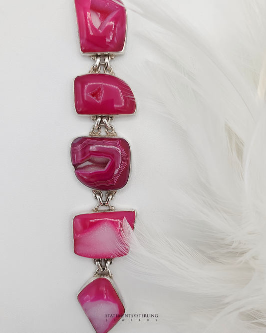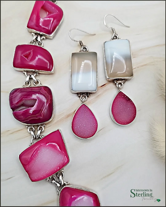 Pink Druzy, Purple Agate and Sterling Silver Drop Earrings