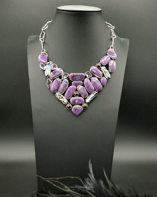 Purple Copper Turquoise, Amethyst, Biwa Pearl and Sterling Silver Necklace