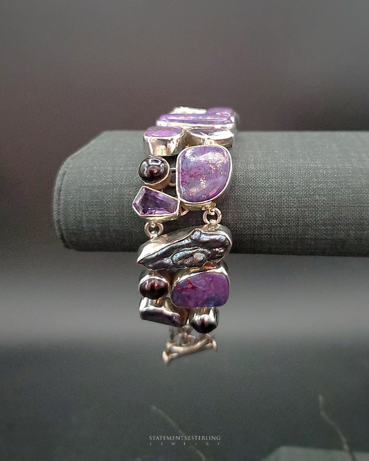 Purple Copper Turquoise, Amethyst, Biwa Pearl and Sterling Silver Bracelet