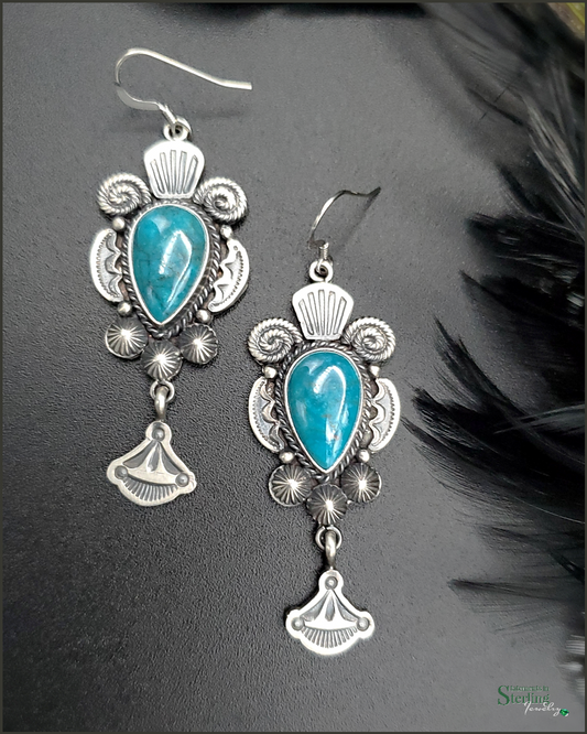 Kingman Turquoise and Sterling Silver Squash Blossom Earrings by Michael and Rose Calladitto