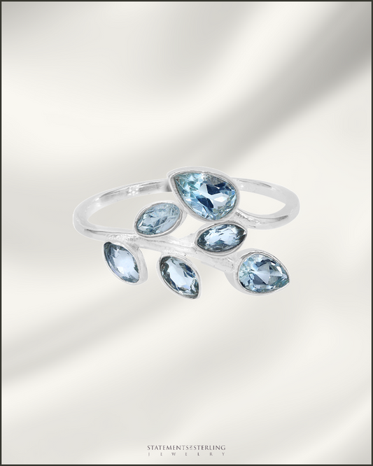 Gemstone and Sterling Silver Leaves Ring in Blue Topaz
