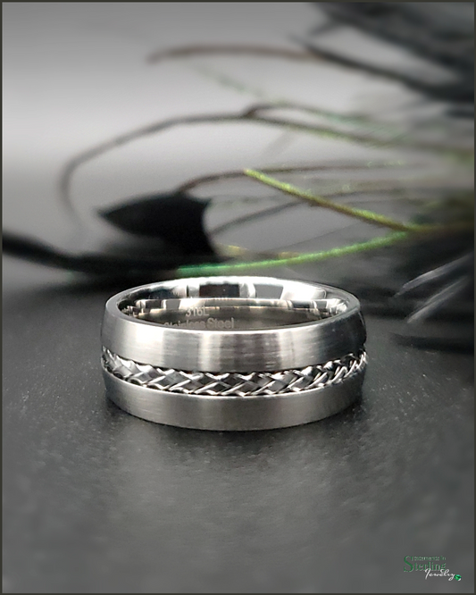 Stainless Steel Cable Detail Ring Band in Brushed