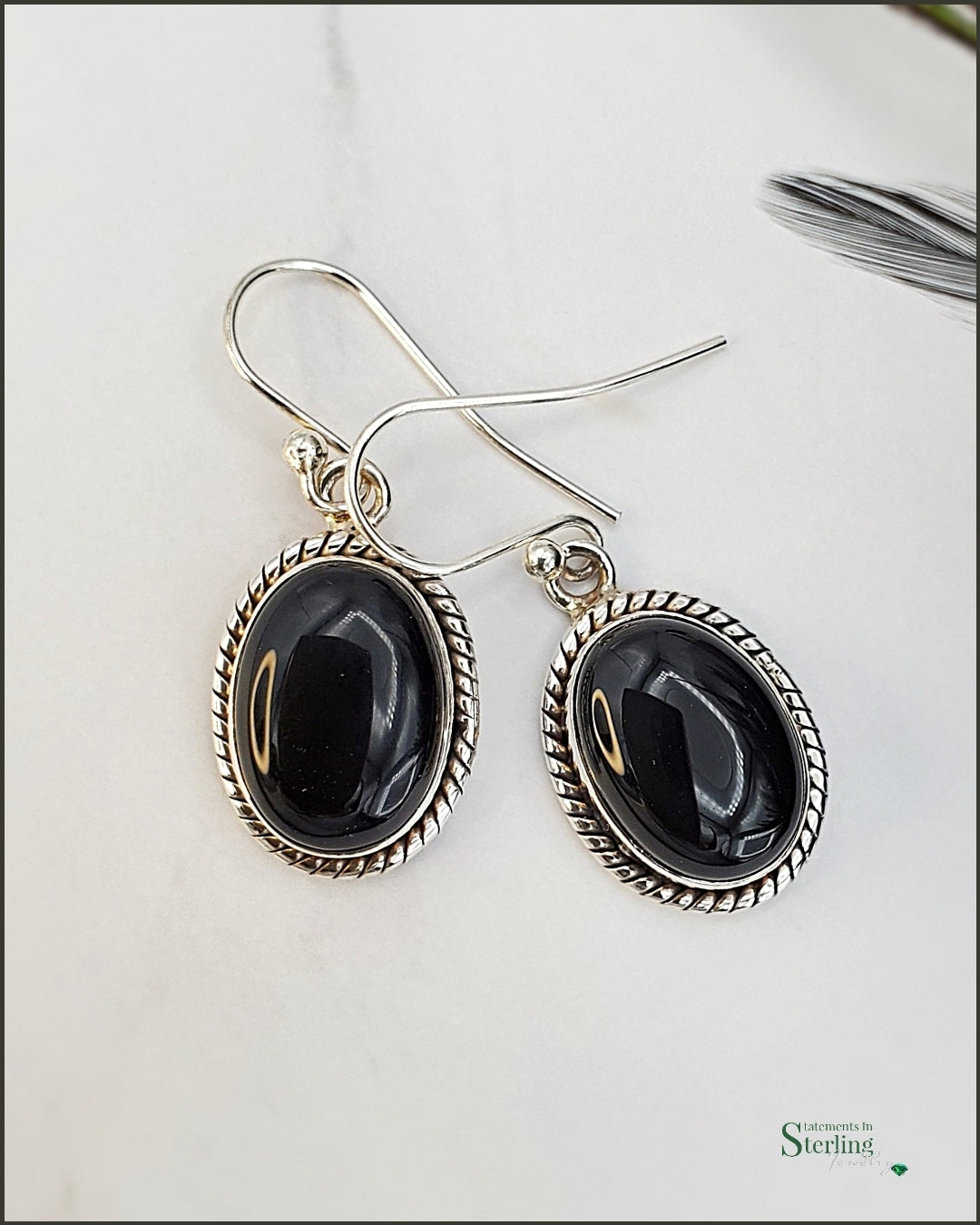 These drop style earrings are crafted of black onyx stones bezel set in sterling silver, with a French hook style back. Lightweight and neutral, these earrings will go with everything!