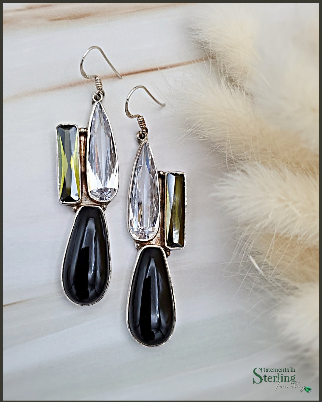 Genuine black onyx, peridot and white topaz stones sparkle in these longer length, handcrafted and one of a kind statement earrings. Gemstones are bezel set in .925 sterling silver and are in a French hook style.