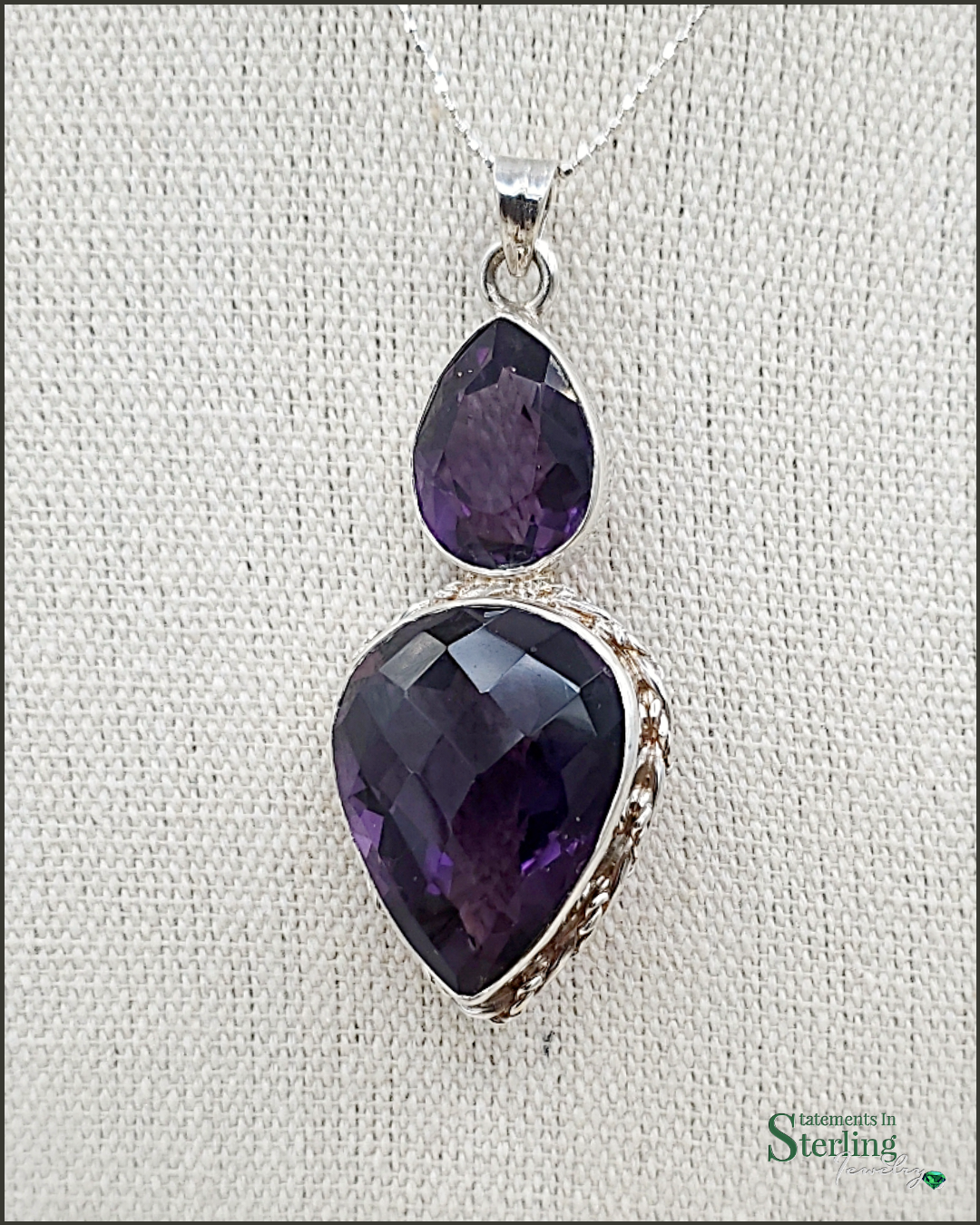Royal purple is the colour of this beautiful two stone quartz pendant. Large bale, detailed .925 silver setting, handcrafted by professional jewellery artisans and one of a kind.
