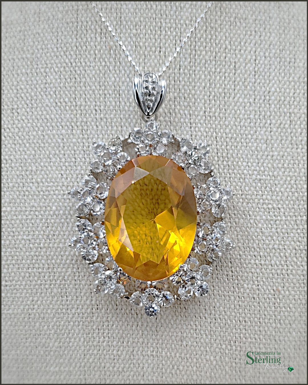 This 70 carat citrine pendant is absolutely stunning! A large citrine stone is prong set in a rhodium plated sterling silver setting and surrounded by sparkling round cut white topaz stones. The bale is medium sized for easy pairing with your favorite chain. Handcrafted by professional jewelry artisans and one of a kind, this is truly a memorable statement piece.