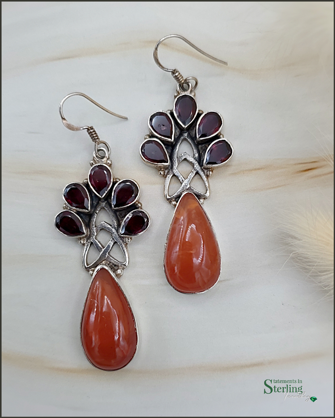 Carnelian, Garnet and Sterling Silver Dangle Earrings