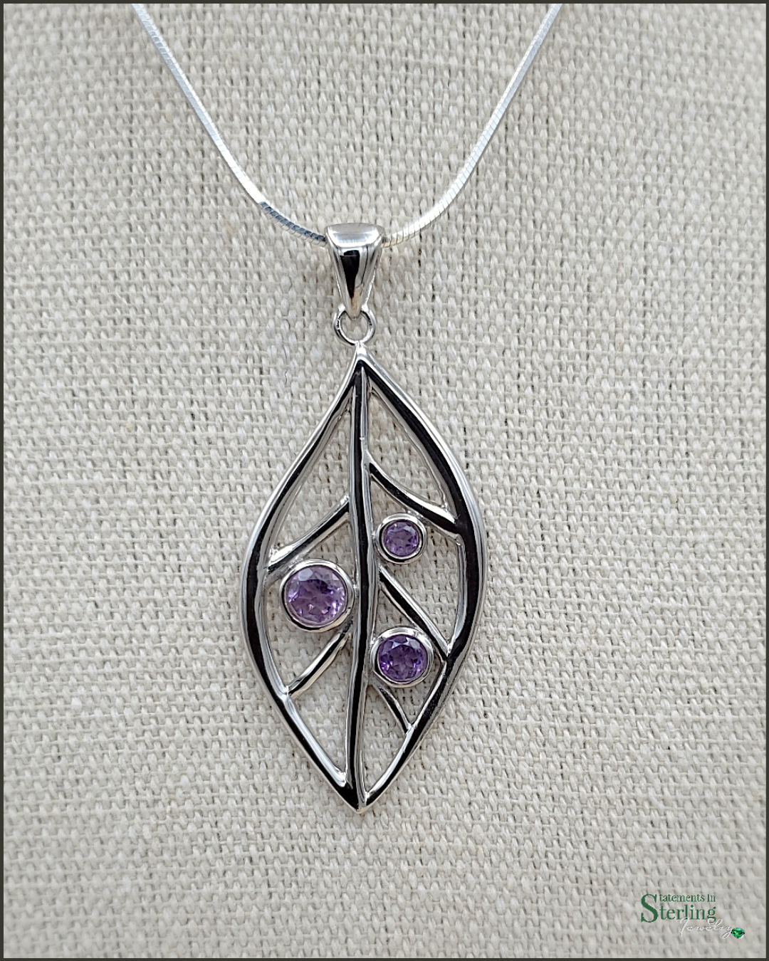 Experience the beauty of nature with our Sterling Silver Leaf Pendant. Crafted in Italy, this pendant features intricate leaf details and bezel-set amethyst gemstones. Made of sterling silver with rhodium plating, it is a timeless and elegant addition to any jewelry collection. FREE Cable chain included with every pendant purchase.