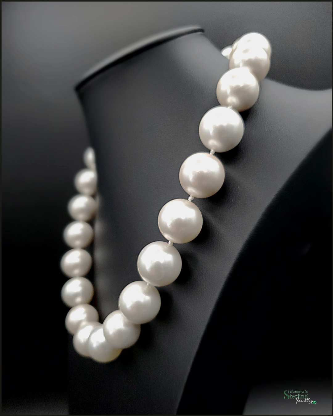 Vintage shell pearl necklace featuring a sterling silver lobster claw clasp and handknotted, shell pearls in a 18" length. Excellent vintage condition, white color.